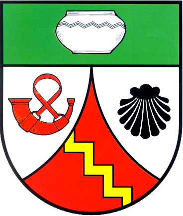 Unter grünem Schildhaupt, darin eine silberne Urne; in Silber eine eingeschweifte rote Spitze mit einem goldenen Sparrenschrägbalken, vorne ein rotes Hifthorn, hinten eine schwarze Muschel.