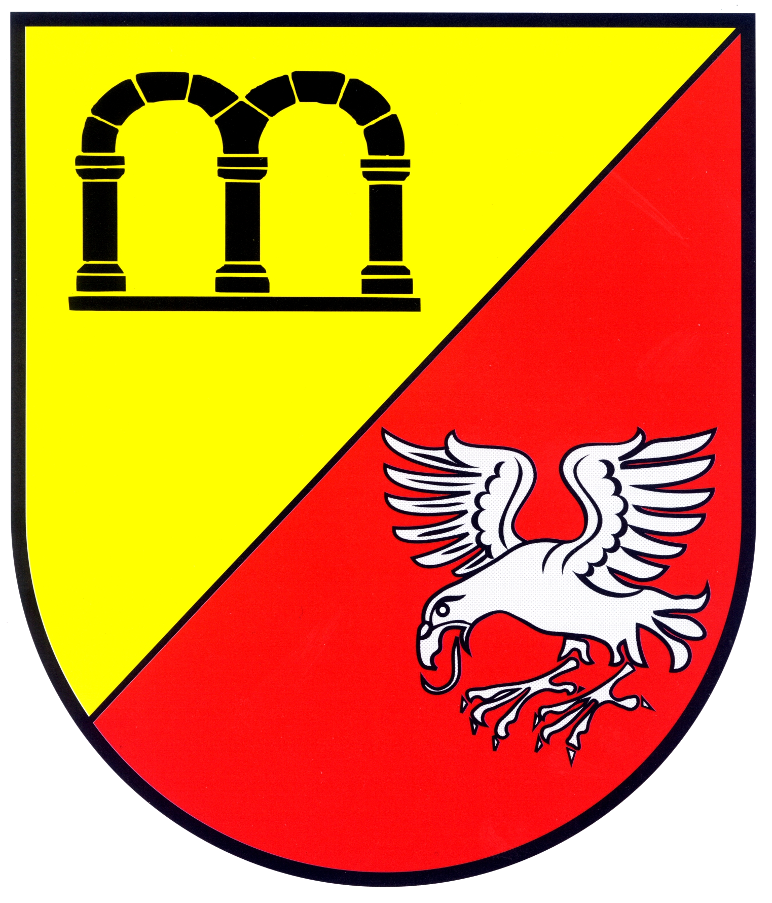 In schräglinks geteiltem Schild vorne in Gold zwei rundbogige schwarze Arkarden; hinten in Rot ein stürzender, silberner Falke.