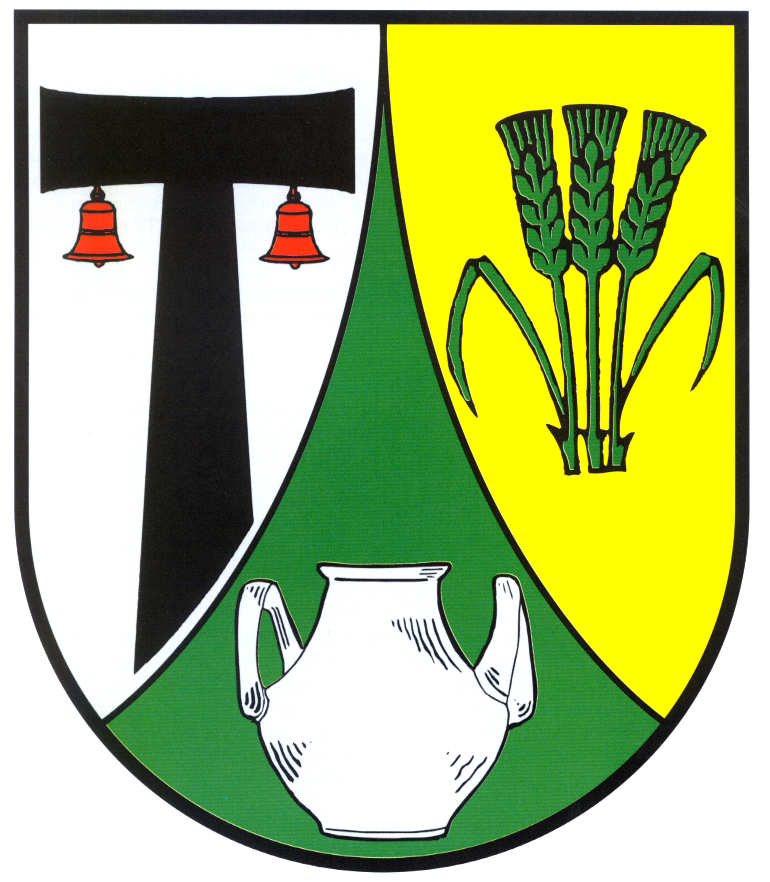Wappen gespalten durch geschweifte grüne Spitze, darin eine silberne Urne, vorn in Silber ein schwarzes Antoniuskreuz, hinten in Gold drei grüne Ähren. Das Antoniuskreuz (Glöckchenstab) ist ein Attribut des hl. Antonius, der seit 1956 als Kirchenpatron aufgeführt wird.