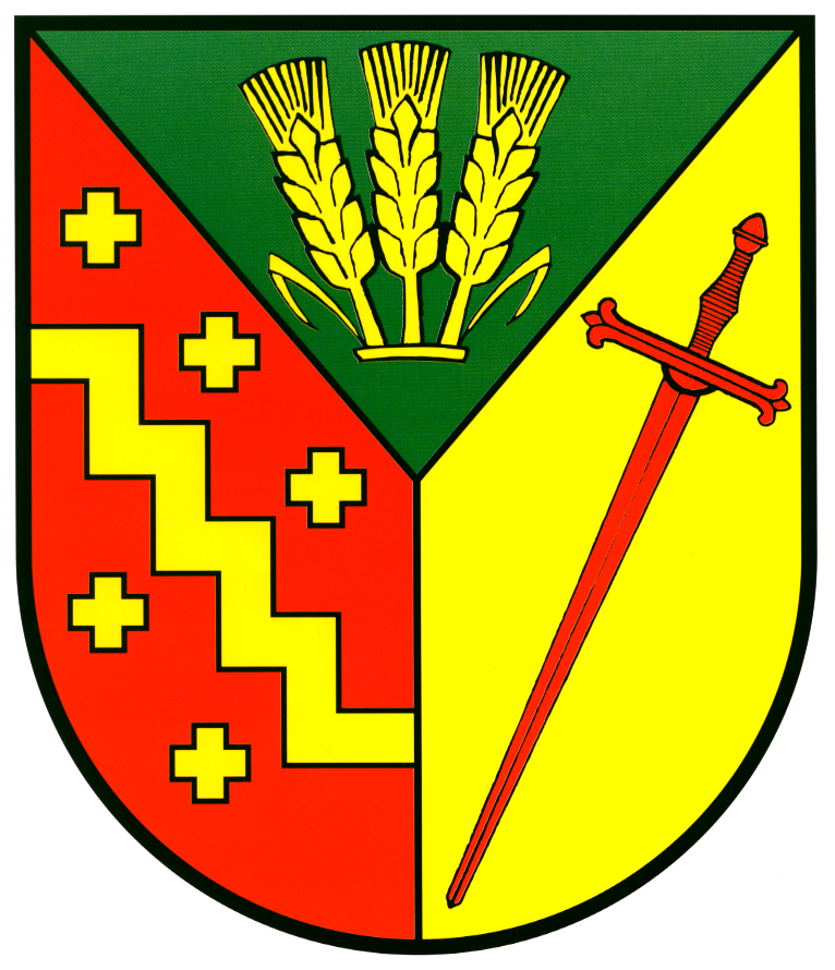 Schild im Deichselschnitt geteilt, oben in Grün 3 goldene Ähren, vorne in Rot ein goldener schrägrechter Stufenbalken, begleitet von oben 3 unten 2 goldenen Kreuzchen, hinten in Gold ein rotes Schwert schräglinks.