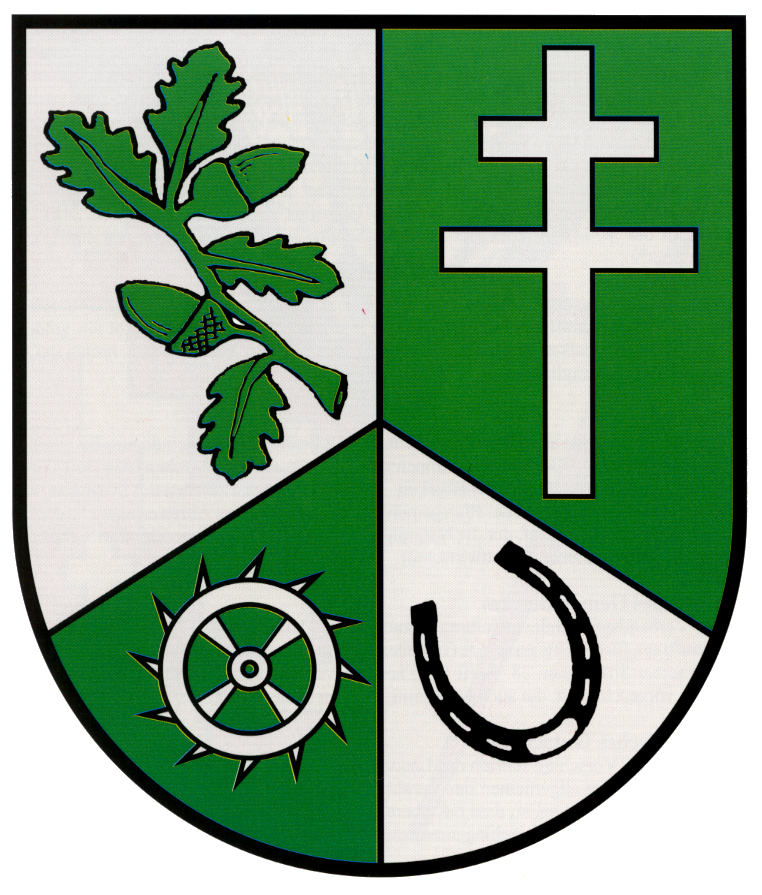Über grün-silber gespaltener erniedrigter Spitze, darin vorn ein silbernes Mühlrad, hinten ein schwarzes Hufeisen, gespalten von Silber und Grün, vorn ein grüner Eichelzweig mit vier Blättern und zwei Eicheln, hinten ein silbernes Patriarchenhochkreuz.