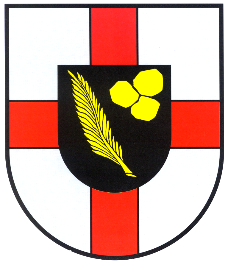 In Silber ein durchgehendes Kreuz, belegt mit schwarzem Schild, darin vorne eine goldene Palme und hinten drei goldene Steine.