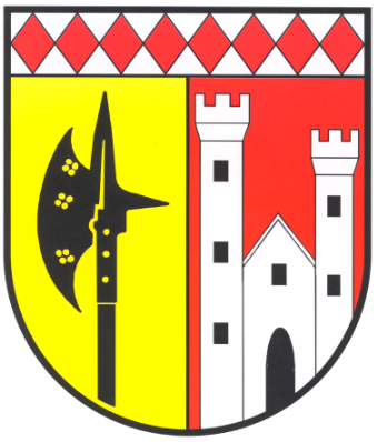 Unter silbernen Schildhaupt, darin rote Rauten, gespaltener Schild. Vorne in Gold eine schwarze Hellebarde, hinten in Rot eine silberne Burg mit zwei verschiedenen hohen Zinnentürmen.
