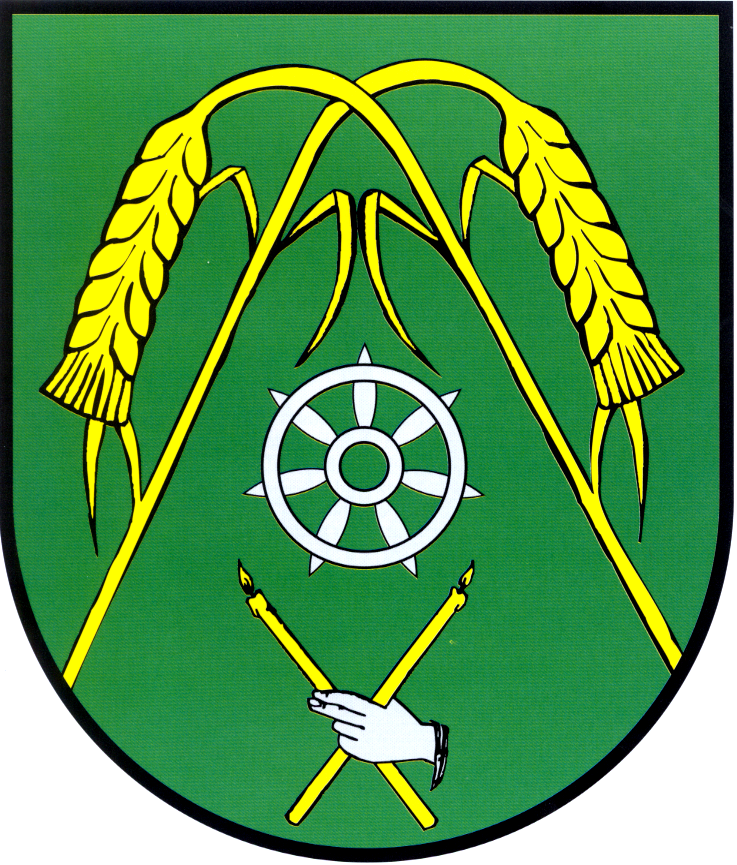 In Grün unter zwei gekreuzten goldene Getreidehalmen, die Ähren abwärts gekehrt, mittig ein silbernes, sechsspeichiges Wagenrad, unten zwei gekreuzte goldene Kerzen, belegte mit einer silbernen Hand.